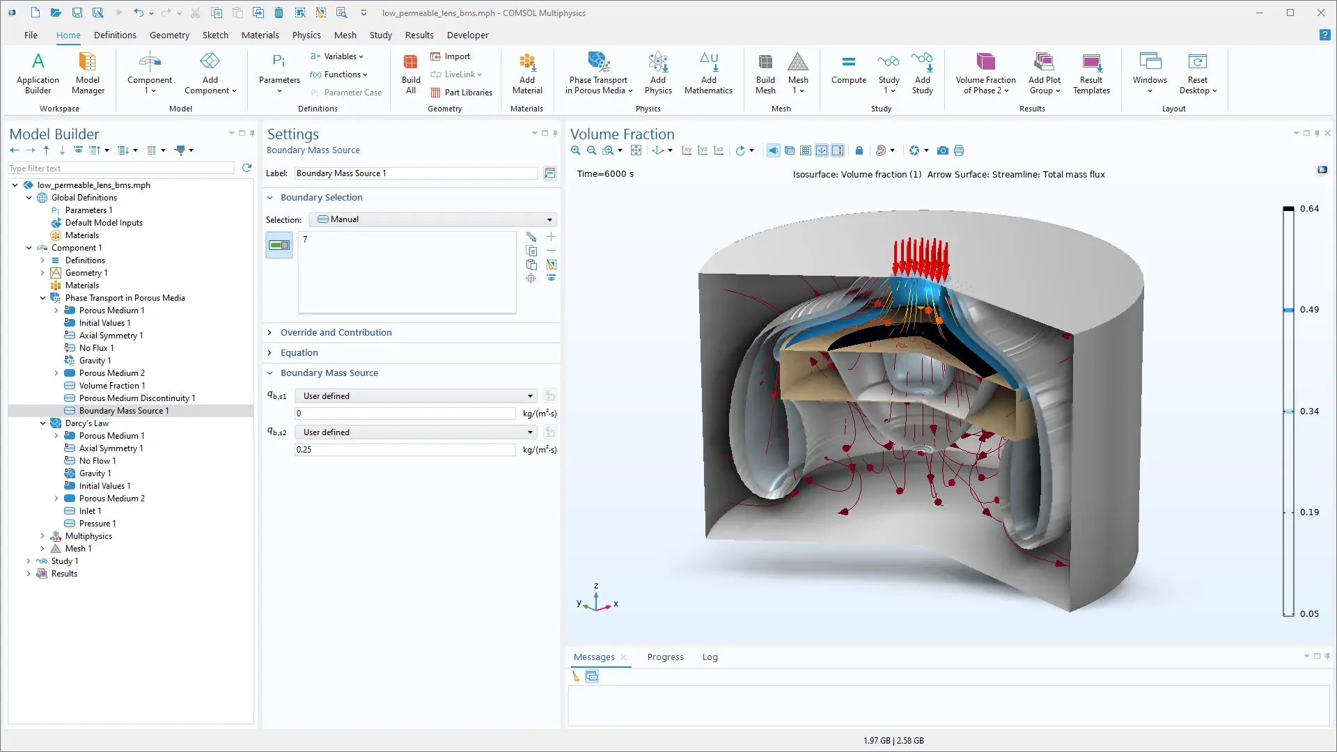 Flujo multifásico sobre una lente de baja permeabilidad. La función Boundary Mass Source se utiliza aquí para configurar fácilmente las condiciones de contorno en el modelo de tutorial Low Permeable Lens.