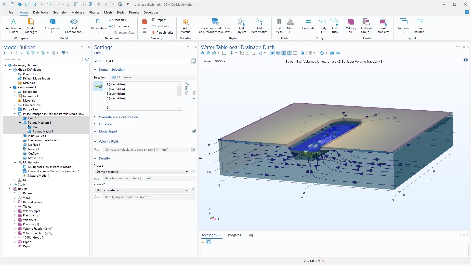 Las nuevas funcionalidades Fluid y Porous Medium se presentan en un modelo que simula la altura del nivel freático cerca de una zanja de drenaje.
