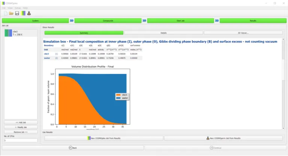 Debido a su capacidad para simular sistemas no homogéneos, COSMOplex también puede predecir el perfil de concentración en una interfaz líquido-líquido o gas-líquido e incluso la orientación media de las moléculas. El perfil de presión interna en la interfaz se corresponde directamente con la energía interfacial. Mediante la aplicación de una función de correlación adicional, la tensión interfacial entre dos mezclas líquidas puede predecirse de forma sencilla. Los líquidos pueden ser complejos e incluso contener tensioactivos.
