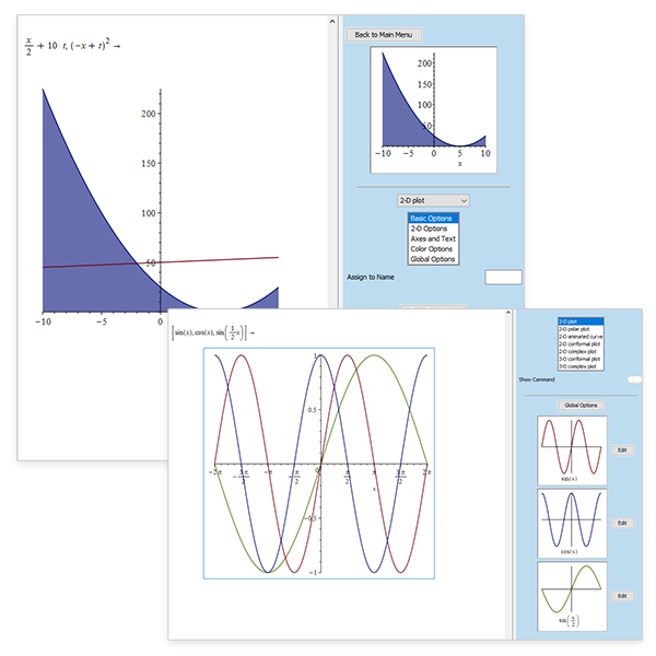 - Visualización: Incluye un amplio conjunto de herramientas de visualización con gráficos típicos predefinidos, gráficos 2D y 3D, animaciones 2D y 3D, una amplia variedad de tipos de coordenadas, gráficos implícitos 2D y 3D, gráficos vectoriales, contornos, gráficos complejos, gráficos de ODEs y PDEs, rotación en tiempo real, objetos geométricos predefinidas, iluminación.
