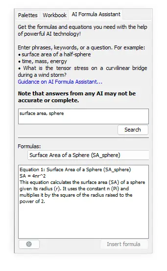 Obtenga las fórmulas y ecuaciones que necesita con la ayuda de la potente tecnología de IA. En respuesta a su búsqueda, obtendrá una selección de opciones relevantes, explicaciones sobre para qué sirve cada una y qué representan los parámetros, y una manera fácil de insertar la fórmula seleccionada en su documento como una expresión de Maple. |