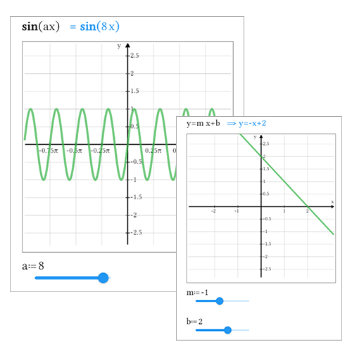 ¿Qué hace la "a" en la expresión sin(a*x)? ¿Qué significa realmente la "m" en y = m * x + b? Muchas ideas matemáticas se expresan utilizando parámetros, pero puede ser difícil desarrollar una comprensión intuitiva de lo que esos parámetros realmente hacen. Con Maple Learn, todo lo que supone crear barras deslizantes para controlar los valores de los parámetros en una expresión es un clic de botón. Entonces se pueden ver los gráficos y los resultados relacionados cambiar instantáneamente a medida que se mueve el deslizador, para tener fácilmente una comprensión más profunda de qué ocurre.
