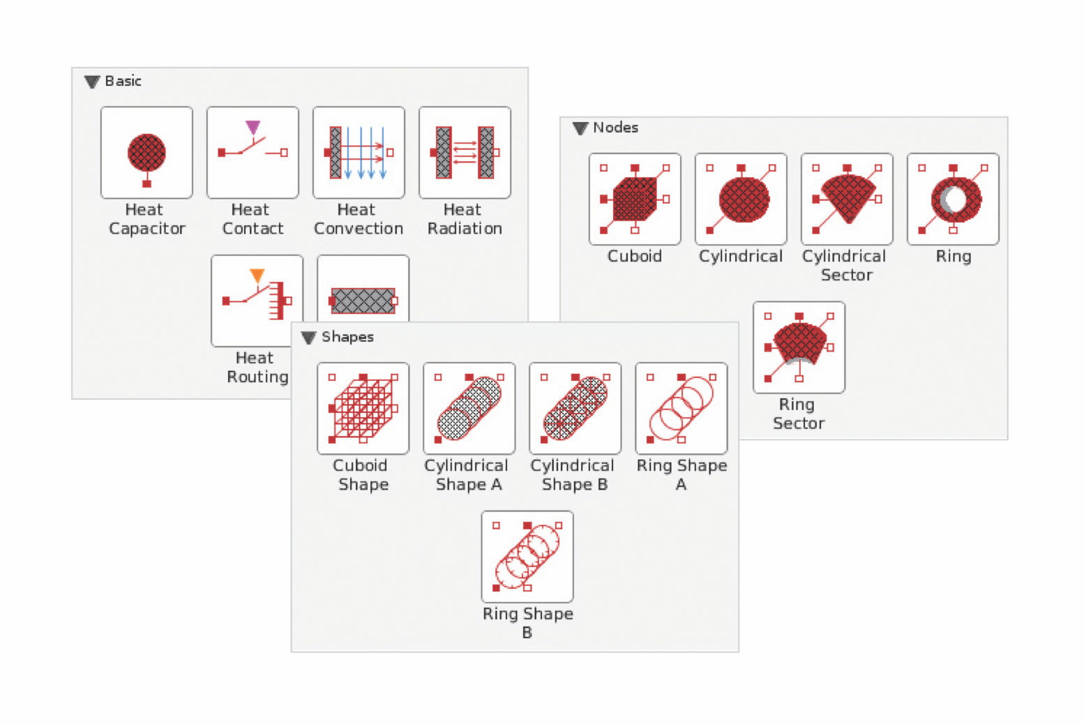 - Nodos: Modela nodos genéricos, que constan de condensadores de calor y conductores térmicos, en varias formas 2D y 3D, como cuboide, cilíndrico, anillo y sector anular