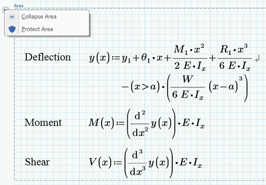 - Verifique, valide y anote sus soluciones. La integración del texto, las fórmulas y los gráficos en una única hoja de cálculo permite visualizar, ilustrar y anotar fácilmente el trabajo de cálculo. Toda la solución se encuentra contenida y se documenta en una sola ubicación. Las opciones de formato y las plantillas permiten preparar documentos de acuerdo con especificaciones exactas. Los cálculos de ingeniería y los trabajos de diseño documentados en Mathcad son más fáciles de leer, comprobar y validar porque todas las suposiciones, ecuaciones, metodología y resultados clave se documentan en notación matemática natural. Los cálculos pueden ser leídos y comprendidos por otros usuarios, lo que mejora notablemente la verificación, validación y auditoría de los procesos.