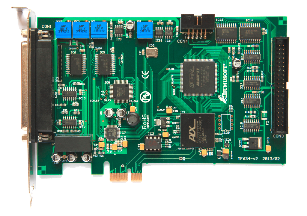 MF 634 es una tarjeta de E/S multifunción que ofrece la mayoría de las funciones necesarias para el control de procesos o aplicaciones de medida. MF 624 proporciona conversión A/D, conversión D/A, entrada digital, salida digital, entrada de codificador de cuadratura, temporizadores, contadores, PWM, medidas de frecuencia y pulso. La tarjeta contiene ocho entradas analógicas de 14 bits con circuitos de muestreo y mantenimiento (sample&hold) simultáneos y tiempos de conversión muy cortos, ocho salidas analógicas de 14 bits, ocho entradas digitales y ocho salidas digitales, cuatro entradas de codificador con receptores de línea diferencial y cuatro contadores/temporizadores. Los codificadores y contadores son de 32 bits. MF 624 tiene una arquitectura de 32 bits para un máximo rendimiento.
