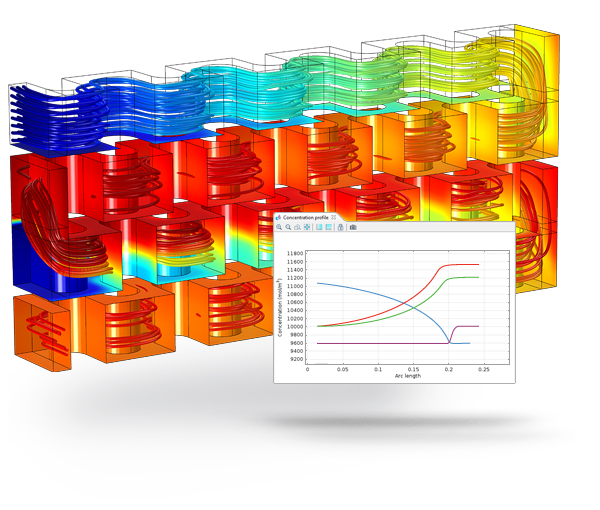La creación de gráficos útiles y visualmente atractivos de sistemas reactivos puede llevar mucho tiempo, ya que a menudo hay muchos reactivos y, por lo tanto, muchos campos de concentración para representar gráficamente. Para ahorrar tiempo, hay una serie de nuevas plantillas de resultados Result Templates en las interfaces Chemical Species Transport. Entre ellas, ahora hay disponibles plantillas de matriz de gráficos que incluyen hasta cuatro concentraciones de especies simultáneamente en la ventana Graphics. Las plantillas de resultados están disponibles para todas las interfaces de transporte de especies químicas, independientemente del producto complementario, pero son especialmente útiles para las interfaces de transporte multicomponente incluidas en los módulos de ingeniería química, así como en el módulo CFD Module, Porous Media Flow Module, Subsurface Flow Module y Microfluidics Module.