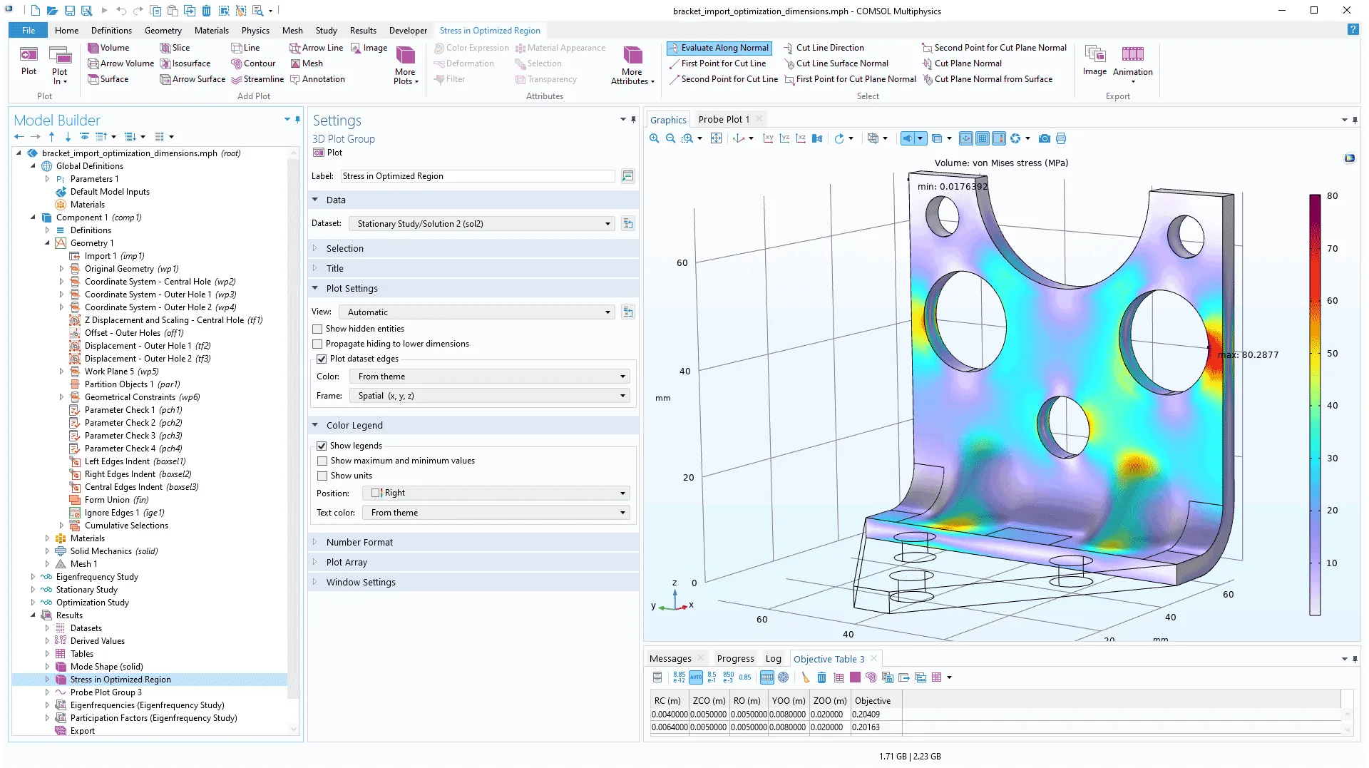 Este tutorial demuestra cómo usar las operaciones Offset faces y Transform faces para parametrizar agujeros existentes en una geometría de ménsula importada desde un archivo STEP. La masa del soporte se minimiza con límites tanto para la frecuencia natural más baja como para la tensión máxima en un caso de carga estática.