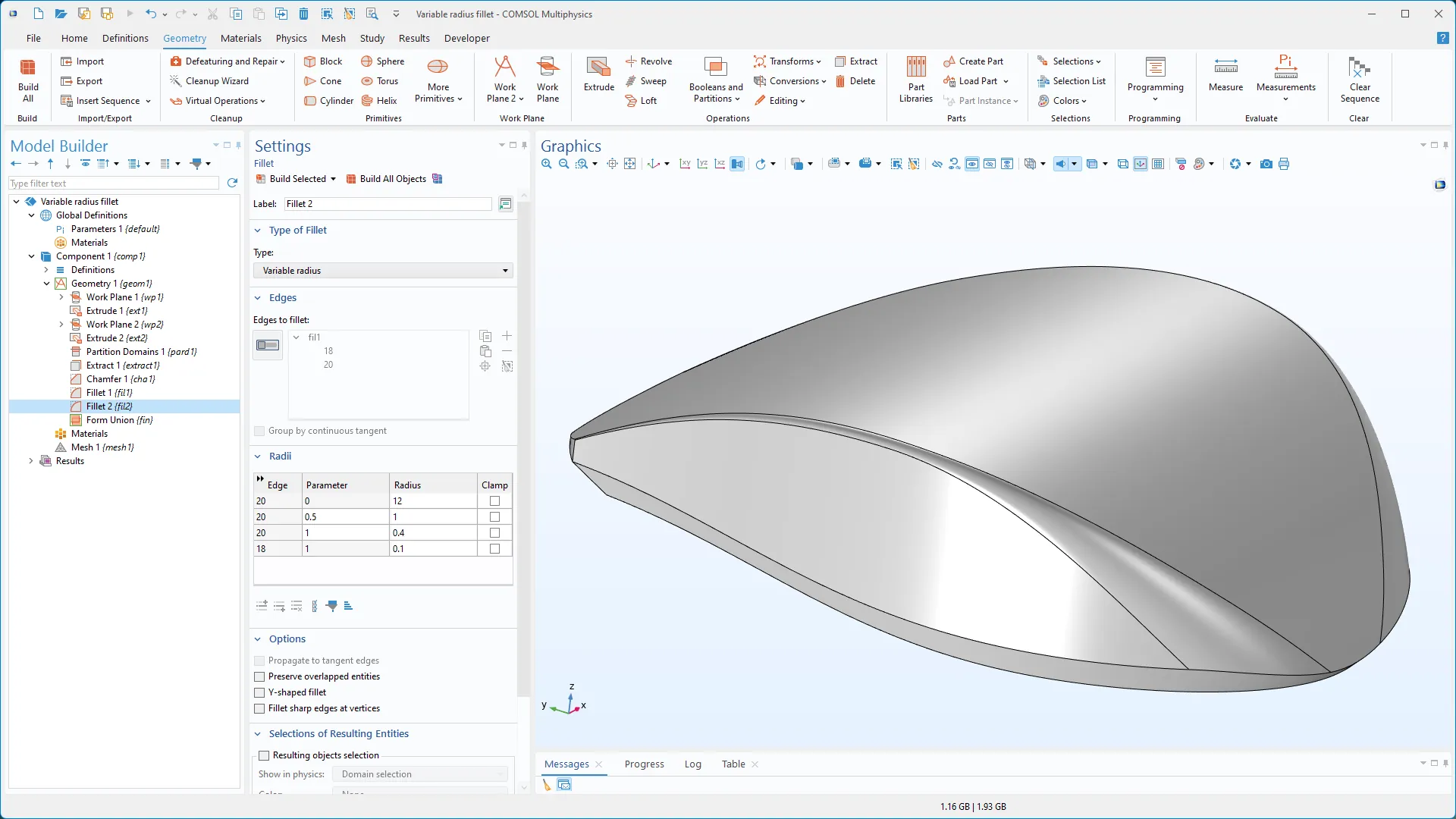 La función Fillet ahora ofrece dos nuevas opciones para una mayor flexibilidad al redondear los bordes de objetos 3D. La opción Variable Radius se puede utilizar para especificar radios que varíen suavemente mediante interpolación en varios puntos a lo largo de una cadena de bordes. La opción Constant Width permite a los usuarios definir un ancho fijo para la cara del redondeo, lo que garantiza que el ancho se mantenga constante a lo largo de todo el borde redondeado.