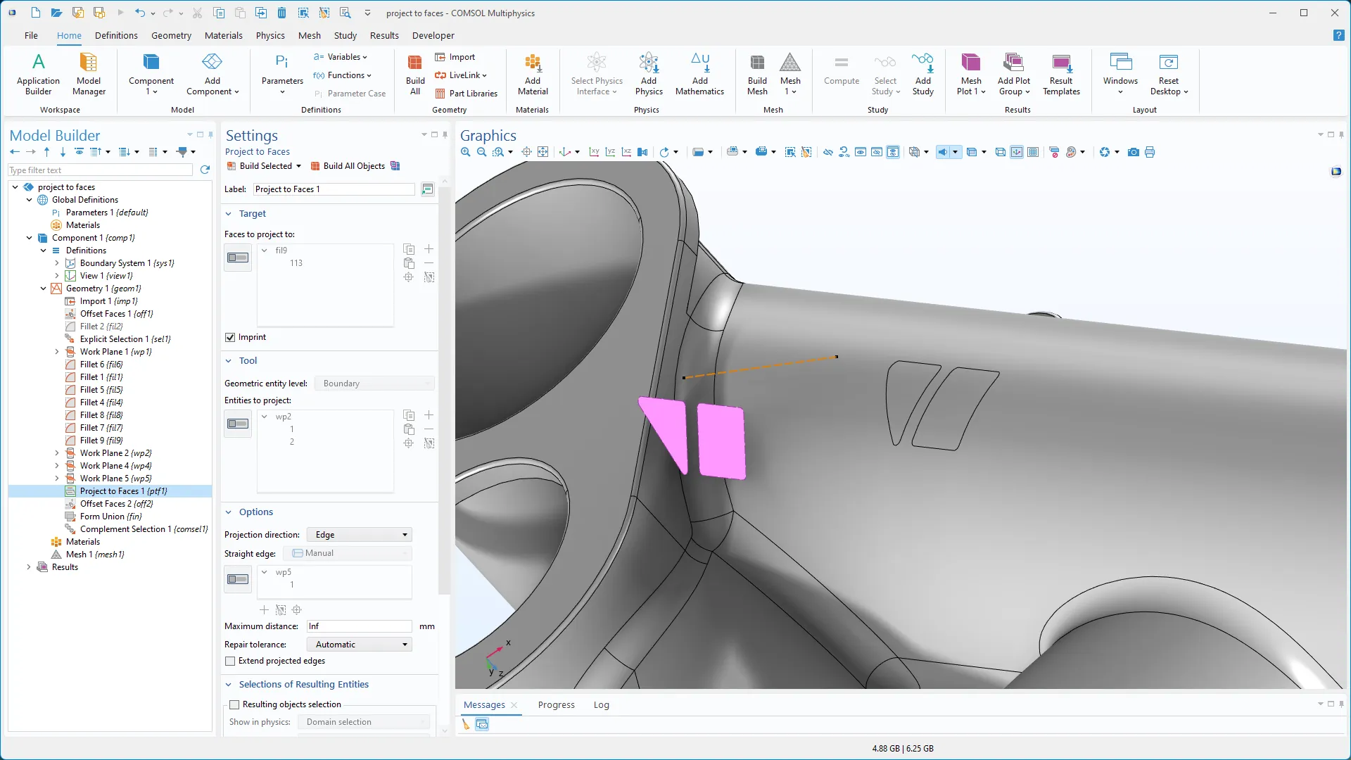 La versión 6.3 presenta varias mejoras para un manejo más eficiente de la geometría. Estas actualizaciones incluyen compatibilidad con los últimos formatos de archivos CAD, la capacidad de obtener una vista previa de los árboles de ensamblaje para la importación selectiva de componentes y la limpieza automática de la geometría para la preparación de la malla. Además, la herramienta Detect Interferences se ha actualizado para ofrecer una detección de espacios mejorada con una tolerancia de espacios personalizable, hay nuevas opciones para redondeos de radio variable y ancho constante, y hay una nueva función para proyectar bordes sobre las caras.