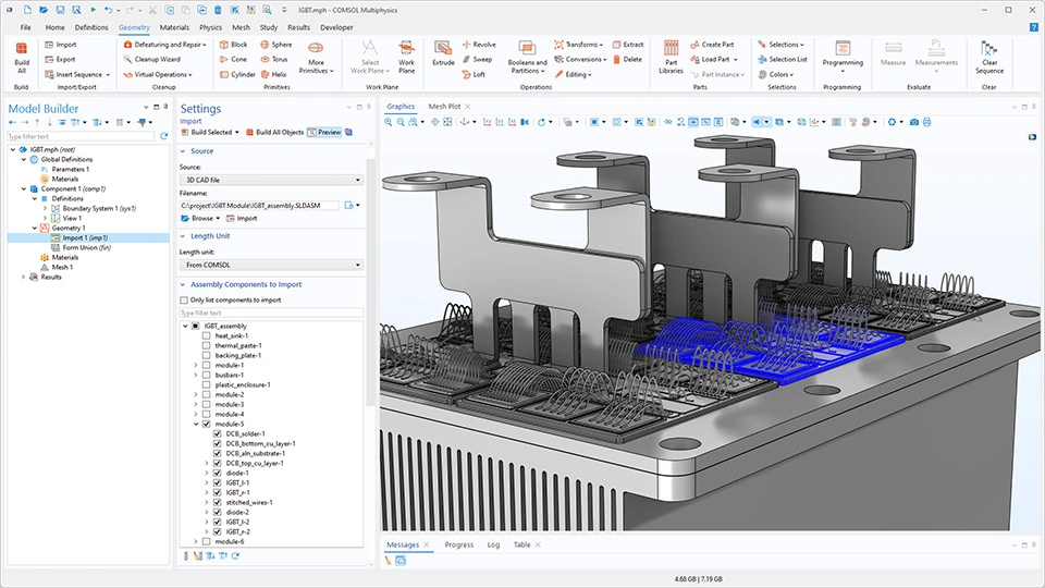 Vista previa 3D de un módulo de transistor bipolar de puerta aislada (IGBT) en la ventana de gráficos. Las selecciones de modelo resaltadas (azul) reflejan los componentes seleccionados para importar en la sección "Componentes de ensamblaje para importar" de la configuración de importación.