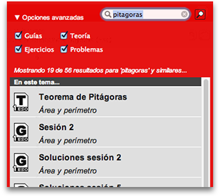 TutorMates tiene integrado un buscador de contenidos. A través del mismo pueden localizarse recursos de cualquiera de los temas existentes, incluso de aquellos a los que, por cuestión de licencia, no se tiene acceso.