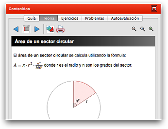Los contenidos de teoría se componen de diversas páginas que, organizadas a través de un índice, que son fácilmente navegables. Incluyen resúmenes teóricos con gráficos y expresiones matemáticas dentro del marco del tema seleccionado en ese momento.