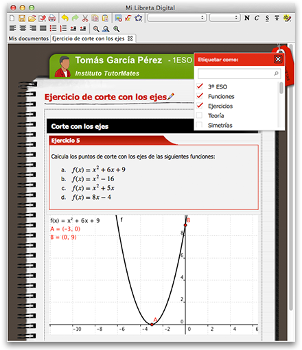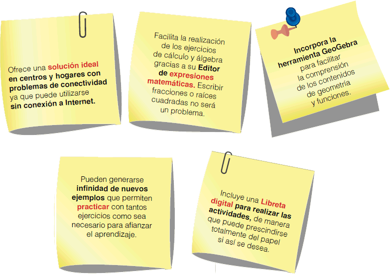 Además, incluye una Libreta Digital que mejora al tradicional cuaderno de papel. En ella podrás archivar cómodamente tu trabajo, combinando fácilmente texto, gráficos dinámicos, fórmulas, imágenes y cualquier otro contenido de TutorMates.