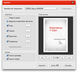 Todos los contenidos de TutorMates pueden imprimirse tanto como documentos PDF como a través de una de las impresoras configuradas en el sistema. El panel de impresión permite personalizar los apartados o incluso páginas que se incluirán en la impresión.