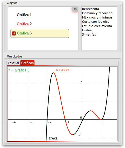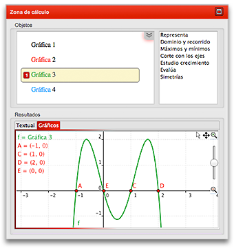 Consta de una estructura basada en el concepto “entrada – acción – resultado”. El panel superior es la denominada zona de objetos, donde se almacenan las expresiones o ejercicios que pueden resolverse, a su derecha aparece la lista de comandos o acciones disponibles dentro de este tema, ese conjunto de acciones son las que interactúan con el Intérprete Inteligente y el motor de cálculo simbólico. En la parte inferior se presenta un panel con dos pestañas, en una de ella es donde van a parar los resultados textuales, mientras que en la otra aparecen los resultados gráficos.