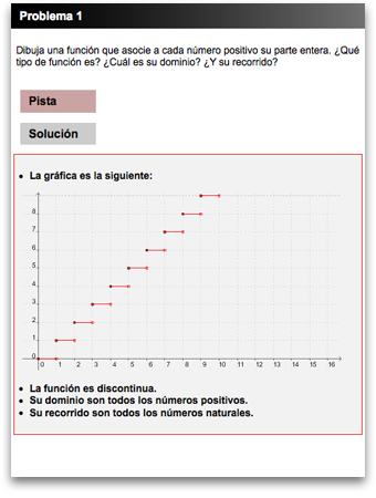 A diferencia de los ejercicios, en los problemas se fomenta el uso de la capacidad de síntesis del usuario, al tener que comprender y contextualizar los enunciados propuestos. Por defecto se muestra el problema planteado con un conjunto determinado de apartados, la solución del mismo aparece oculta. Haciendo clic sobre el botón de solución es posible mostrarla u ocultarla.