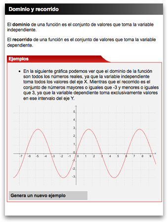En algunas de las páginas es posible generar ejemplos aleatorios adicionales sobre el concepto que se está trabajando. Al tratarse del módulo de teoría, los ejemplos no proponen actividades nuevas, sino que únicamente pretenden afianzar los conocimientos adquiridos a través de la repetición.